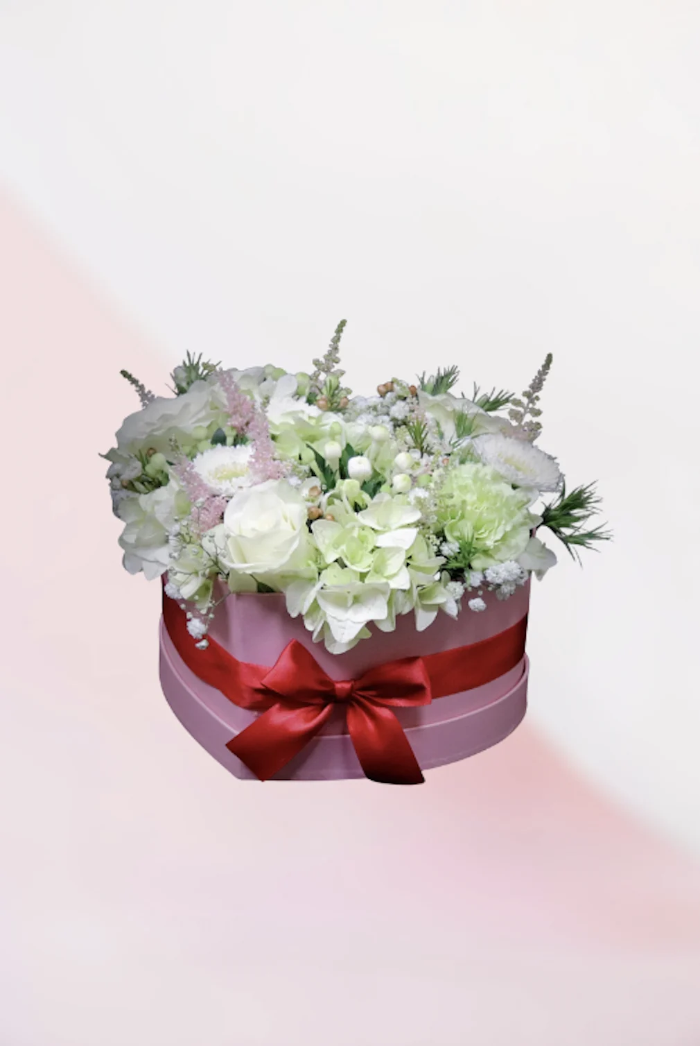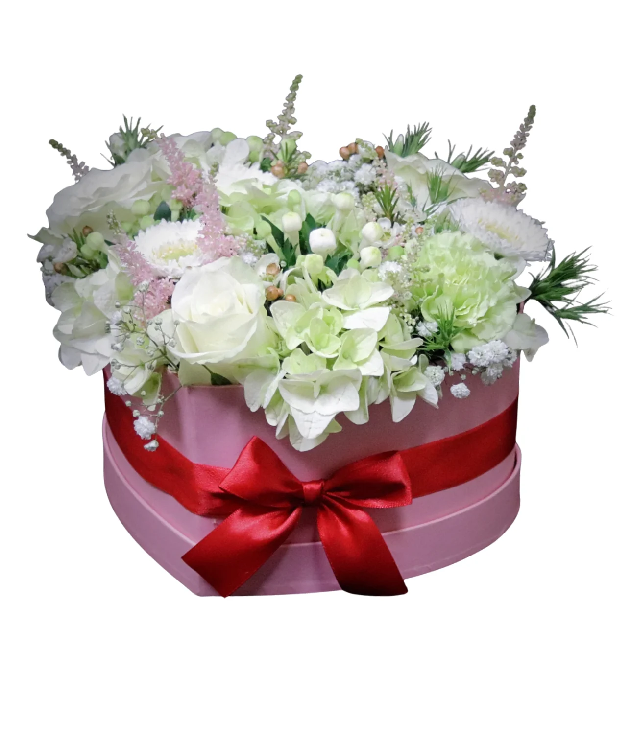 Deze schattige flowerbox, met witte bloemen, in hartvorm is een perfecte bloemen cadeau als je iemand een warm, liefdevol gebaar wilt geven. De box is gevuld met verse witte en groene bloemen uit het seizoen, een stijlvolle en tijdloze combinatie die altijd goed is.