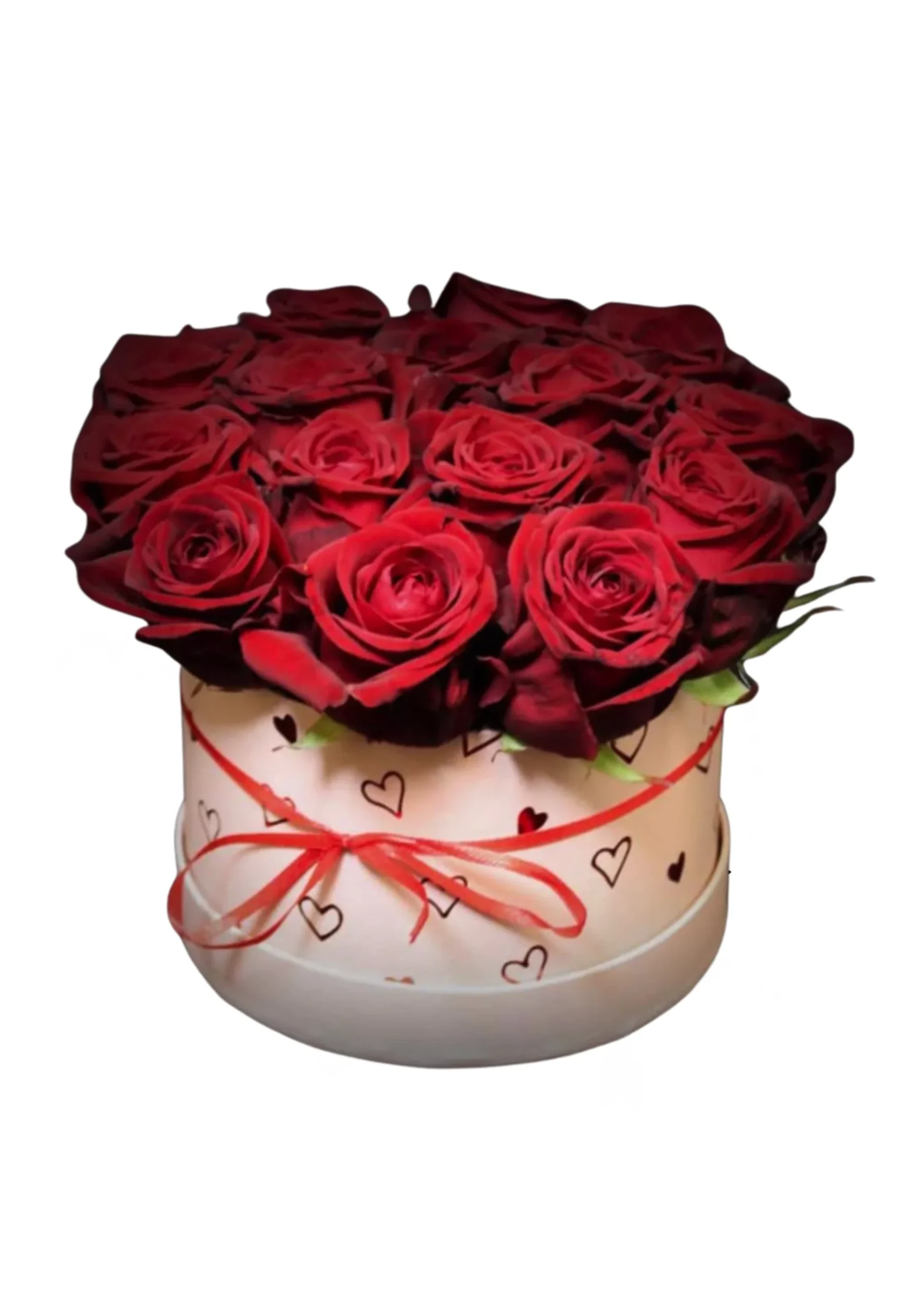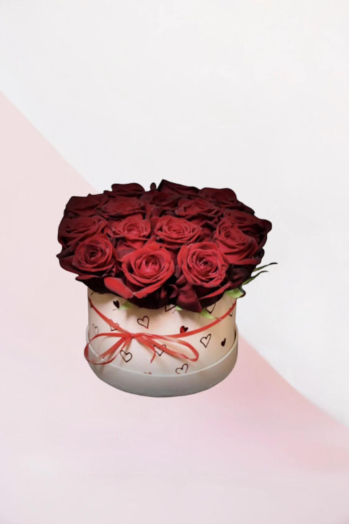 De box is lichtroze en versierd met schattige rode hartjes. Hij wordt gevuld met ongeveer 15 tot 20 verse rozen, rechtstreeks van de veiling zodat de ontvanger lang kan genieten van de prachtige rozen.