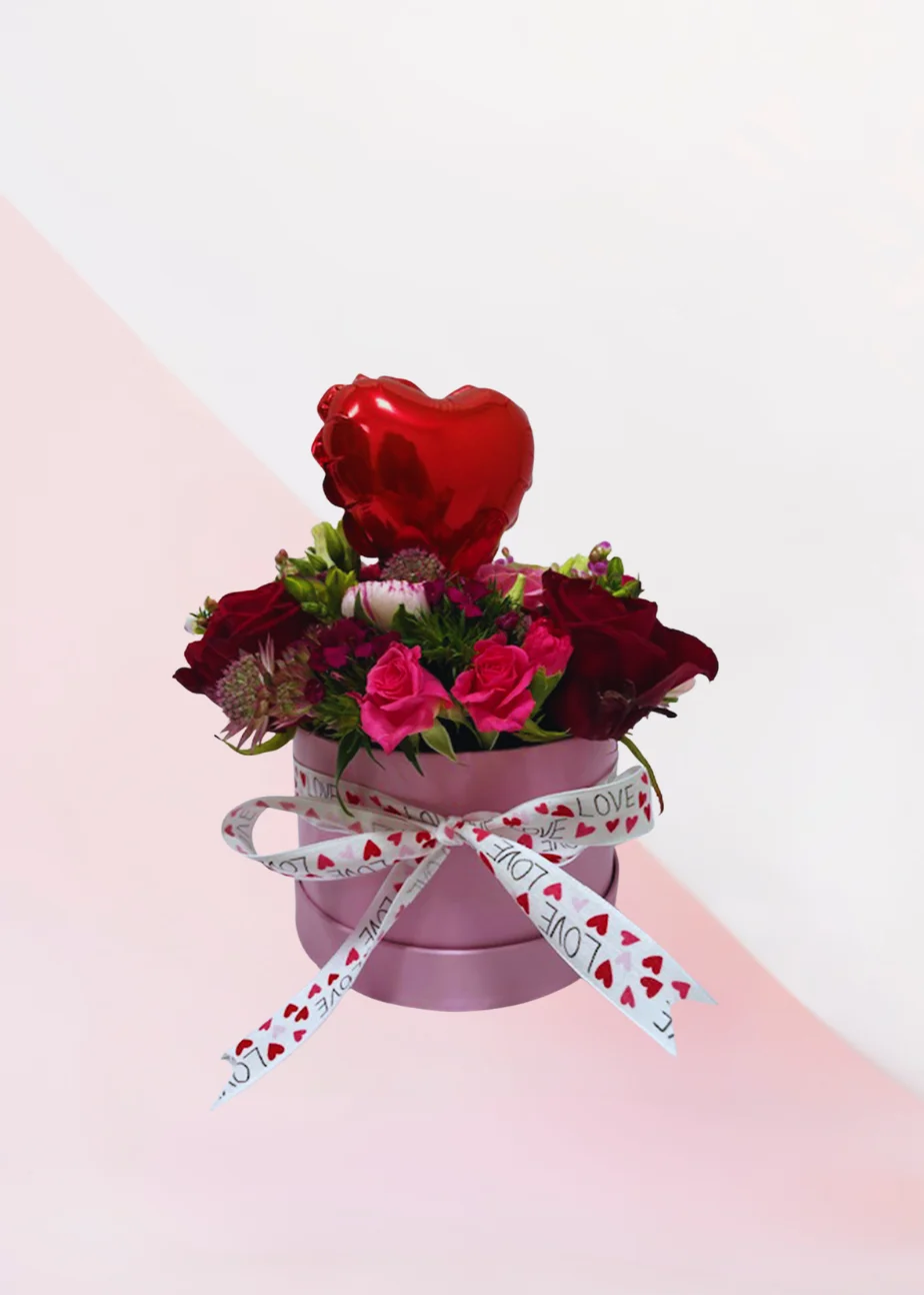 Love box red & pink with heart, een bloemen box vol met rode en roze bloemen. Geen vaas meer nodig! Super leuk om te versturen als cadeau.
