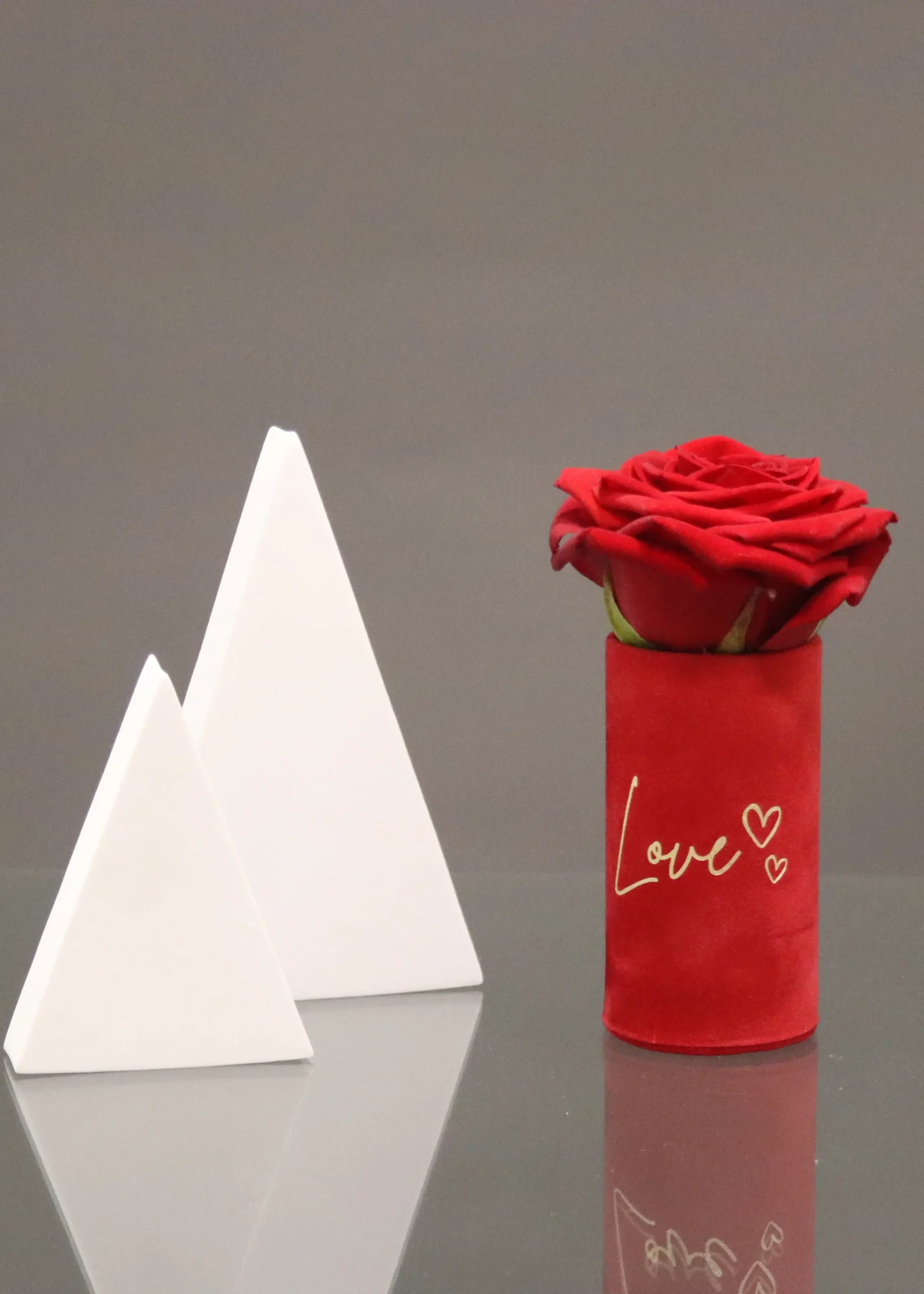 Deze velvet bloemen doosjes zijn 5 x 10 cm en passen precies in de luxe geschenkdozen hier zit één roos in.