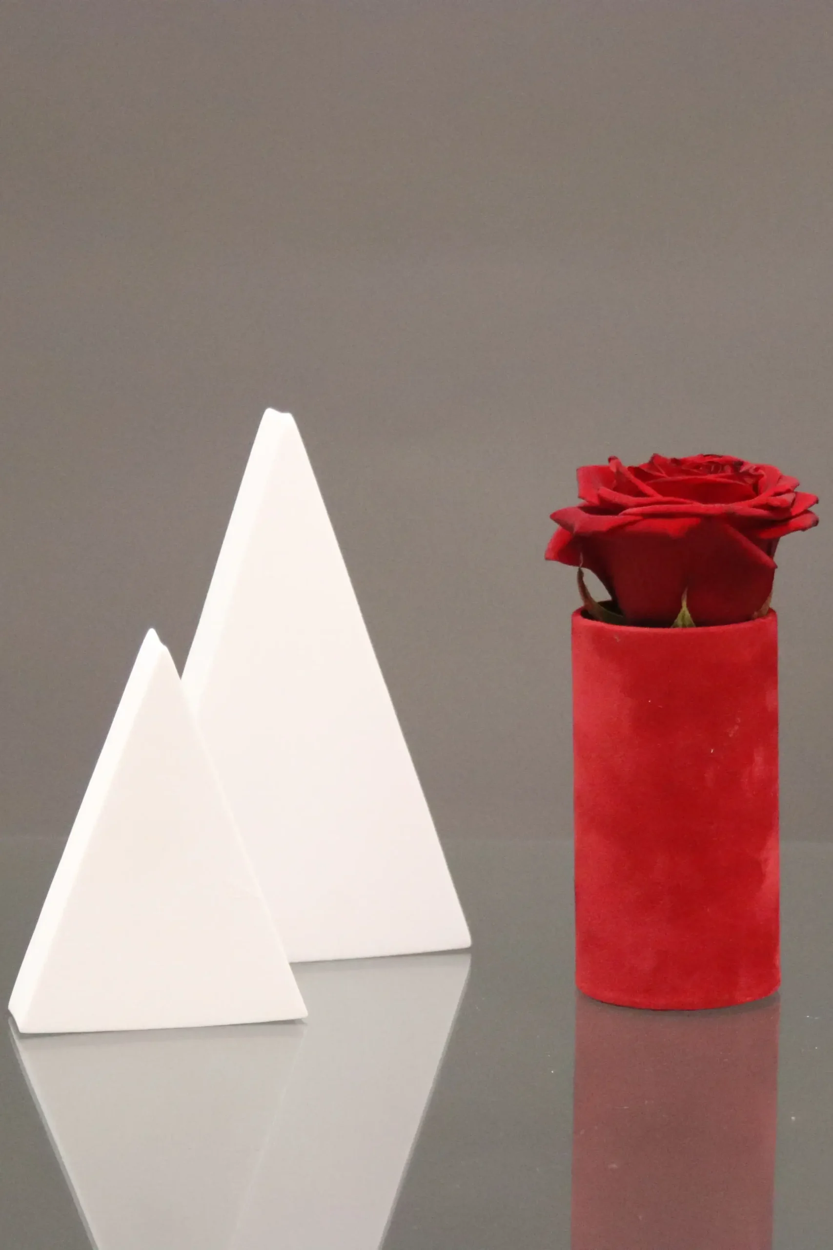 Deze velvet bloemen doosjes zijn 5 x 10 cm en passen precies in de luxe geschenkdozen hier zit één roos in.